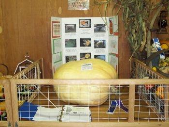 This display was put on by the folks at the Riverview School. Jodi was a smaller pumpkin that grew on the same plant as Uncle Sam. Her estimated weight was 134 lbs. Behind her is a display board filled with various pictures of the Kid's patch as well as some instructional pictures. The binder below was their grower's log. You wouldn't beleive the detail this book had. Just look at you thick it is... You'll notice that the page it is turned to is a printout of the homepage of this site... Thanks for supporting the site!