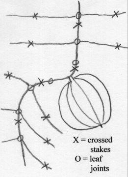 THINK BIG!!! Make the "S" curve large enough for a 5 foot wide fruit, with room to spare, and don�t leave side runners close to the fruit. You will have enough other runners. Channel the side runners near the fruit out of the fruits final area so they can root without having to be moved out of the fruits way later. Don�t cover the vine with dirt for about 2 feet ahead of the fruit to about 3 feet past the fruit.