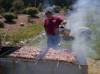 This is Andy Compagna, aka. Junior, working his magic. He is pouring on his special marinade. This is his own custom portable barbecue pit.