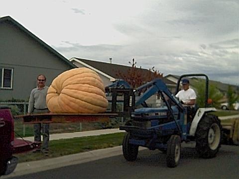 Here is a shot of my 651# pumpkin being loaded for the Spokane Fair on Sept.5 02. It was still growing 10 to 15 pounds per day when harvested. I would have liked to keep it untill October for the weigh offs but alas we sold our house and had to move....