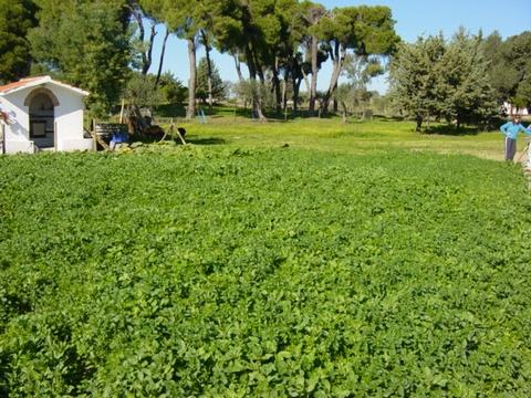 The cover crop of another angle, on the background, mediterranean pines, the tools and fertirrigation hut on the left and beautiful wife on the right