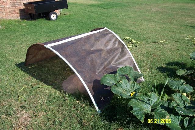 This pumpkin cover is made of 1/2 inch pvc - 2 pieces 8 foot long with a pipe tee in the middle, one cross piece 4 foot long. All glued together. The shade is made from ground cloth used to stop weeds. It allows a little sun - lots of air no heat trapped and water passes through. I used duct tape to hold it on while i wraped string around and down and around each pipe. Larry Landon