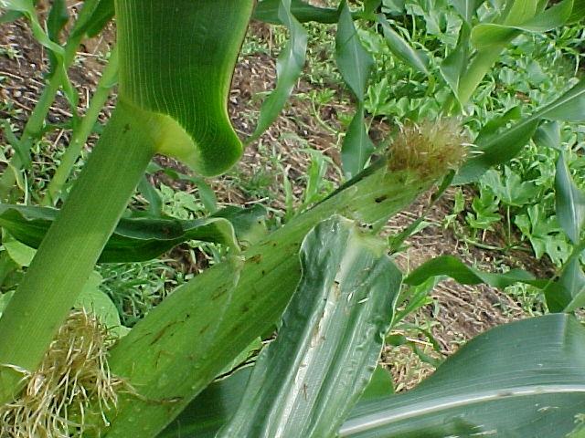 THE BEETLES ARE IN THE CUT SILK(LOWER LEFT). THEY ARE MUNCHING AND AND HUMPING!!!SMUSH! It had only stopped raining for 25 mins., and the evil lumberjacks had already killed one ear of corn!