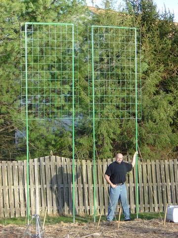I just finished putting up my garden trellis that I'm using for long gourds and skyrocket tomatoes. I used 1 inch galvanized plumbing pipe (two 10 ft.pieces connected for each side) that I got at Home Depot, and livestock fencing that I got from www.farmtek.com. I used heavy duty zip-ties to put on the fencing to the pipe. I dug the holes down to 3 ft. and used concrete to secure them. I still have to put the bottom 8 ft. section of fencing on the bttom half. I put the thing up and realized how you could see it a mile away with the galvanized metal; so I went back to Home Depot and bought some green paint and painted it. Not finished with the painting, but at least it's not sticking out like a sore thumb anymore. It was not easy to paint once it was up. Should have thought about that before I put it up. :-)