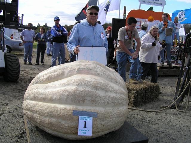 #1 Armand Michaud from Ispwich, MA (Home of the first Fried Clam) displays his 887 pound Atlantic Dill Giant Pumpkin at the Frerich Farm 2006 SNGPG Weigh-off. Real nice Fall day in Warren, RI.