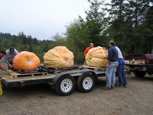 This is a load from the patch headed down town to the weigh off. Keep in mind that all of these pumpkins were grown with in 2 miles of the ocean. I am looking to trade seeds.The pumpkin on the front of the trailer weighed in at 886 lbs. It took the competition.
