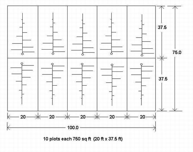 Layout for a 75 x 100 ft patch. 10 equal plots 20 x 37.5 ft