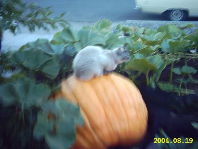 I rushed to snap the cat before she jumped off the pumpkin......so things got blurred.......anyhow this is a pic of smooth skinned pumpkin on the 616 Corkum squash cross plant in August.