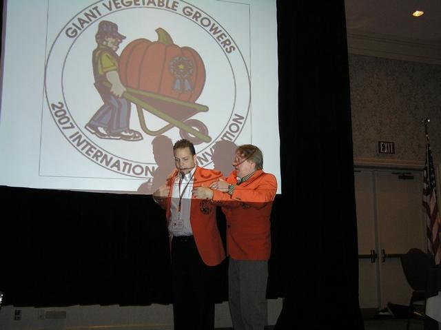 Larry Checkon, presents the Champ, Ron Wallace, with his new "Orange Jacket" for his world record 1502, at the GVGO seminar in Niagra Canada