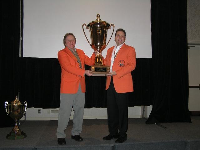 Larry Checkon, present Ron Wallace his GPC Trophy for growing the WR1502Wallace 06, Giant Pumpkin. Photo taken at the GVGO Growers Seminar at Niagra.