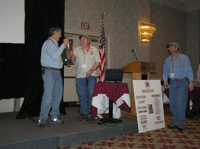 Current world record Long Gourd Champ, Joe Jutras, recieves trophy for his 126.5" Long Gourd, grown in 2006, from Phil Hunt. Thats moderator Jim Beauchemin from New Hampshire looking on.