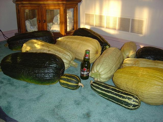 I didn't have anything huge this year, but at least I have some marrows this year. Last year I didn't have a single one. I still have more to pick up in NY, but this is most of them. The white marrows came from Bernard Lavery's 112 lbs. marrow from last year. Strange, because his was very dark green. Everyone of mine came out white, and one came out bright yellow. They are from multiple plants, grown in multiple locations (both NY and NJ) and all were this color. The dark green marrows are from my 2004 seeds. The long striped marrow is a tiger cross (culinary type) and the small, rounding marrow is a table dainty (culinary), both of which I will be eating.