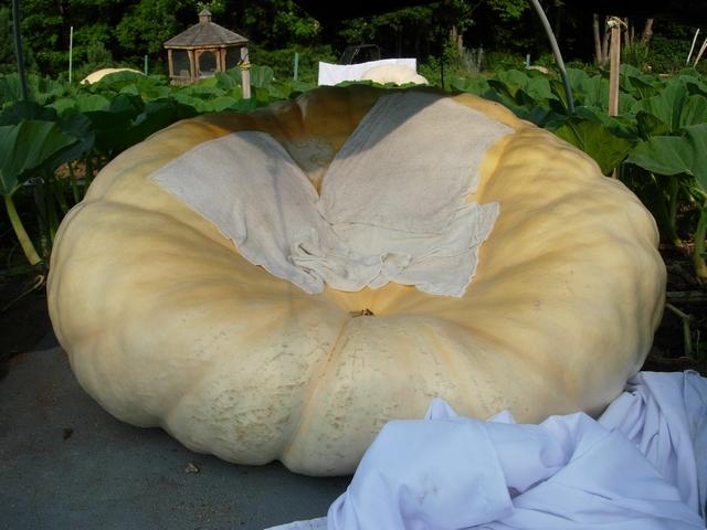 Started out as number one plant and fruit in the garden. Made a mental mistake and used a dark tarp when it was 300lbs. Sunburn occured and it never healed correctly. Split at the burn around mid August.