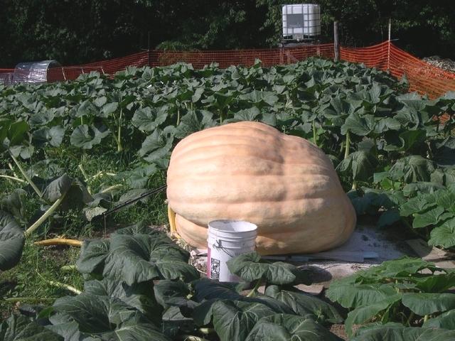 Side shot of the 990.5 before harvest. Cross was 1133.4Demers03 x 670Daigle03. Huffer and I chose this cross for hybrid vigor only time will tell. The backrounds on these two are different. This pumpkin developed a split early on on the stem and in mid Aug. rot set in and I lost the stem. It was weighed on Sept 2 .