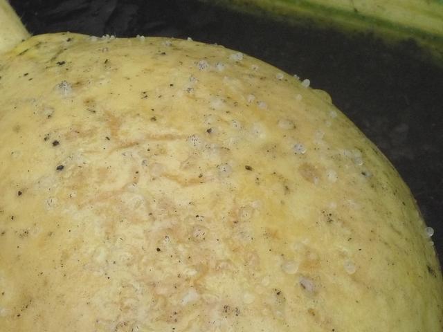 Went to check on my pumpkin and this is what I found. This is an Atlantic Giant that I'm growing and it is only 10 days old in this photo. The first day I noticed it, it looked like a pile of hail sitting on my pumpkin and when I went to wipe it off it was sticky and not willing to easily wipe off. I applied an insecticide, fungicide and took the mass off. Here I have a picture of what it looked like the next day. No large mass but small spots covering my pumpkin. I have no idea what it is. I culled this pumpkin so that it would not spread if it was pest related. Any ideas???