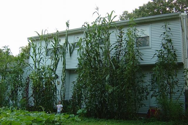 Daughter standing next to some giant amaranth plants