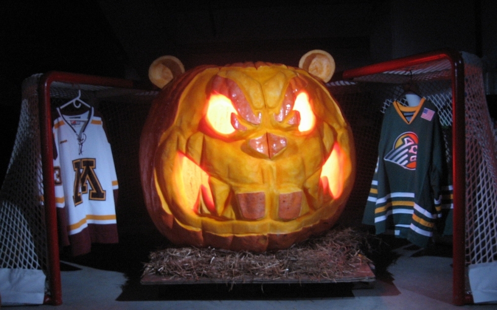 1028 Gienger 2009 Carved Mariucci Arena Minneapolis About to be filmed for the return from commercial screen by FSN. Another angle.