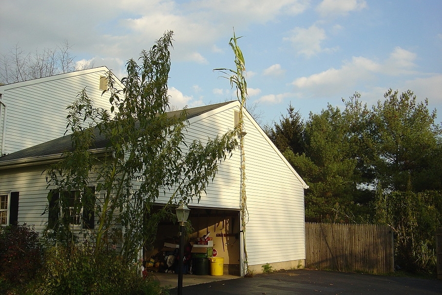 Another pic of the 25 feet 9 inch maize next to my garage. Plant in the front is a giant amaranth