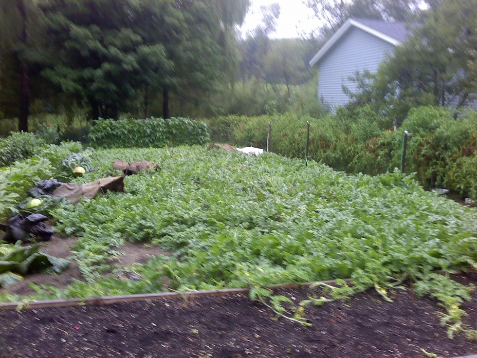 Three hills with four plants. Notice the t-posts and shower heads over each of the stumps. Cukes at the end, cabbage, and even Okra. Sorry for the quality of the pictures, but it was a dreary day.