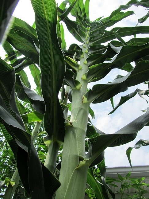 Looking straight up a giant cornstalk. This particular maize is the Tehua race from southern Mexico. The stalk has a 8 inch stem circumference.