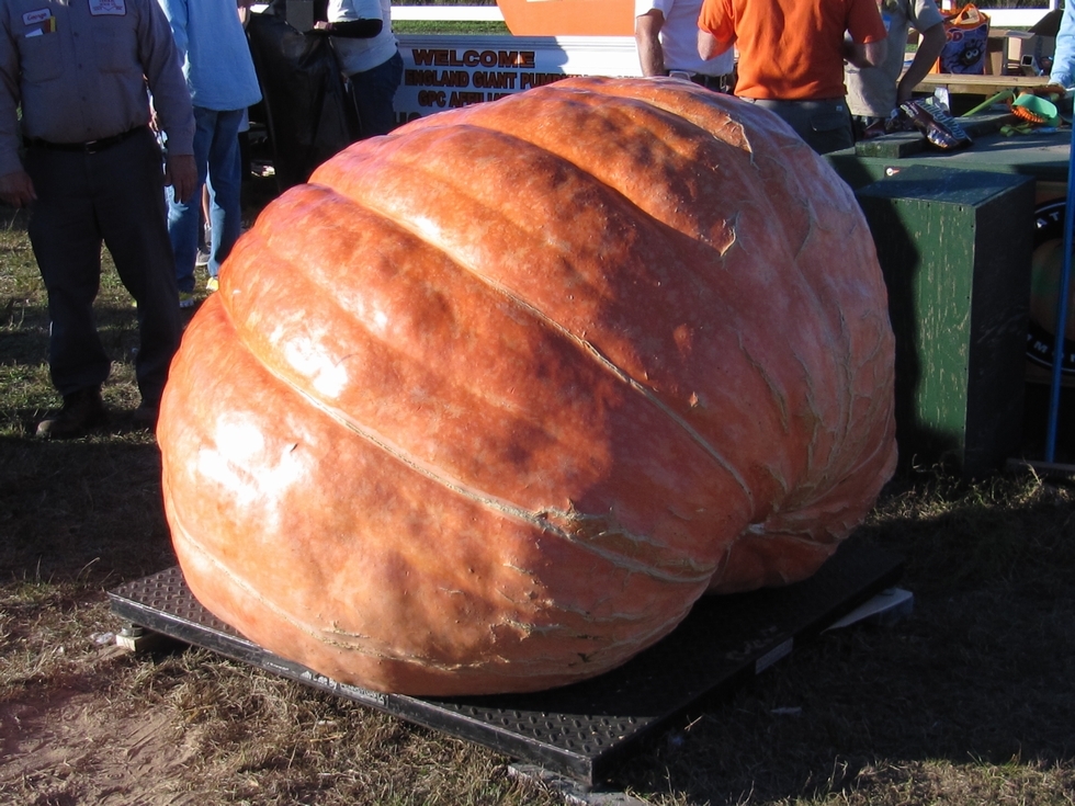 This shows more of the blossom end of Charles Lieber's 1610 pound winning pumpkin at the Frerichs Farm weigh-off.