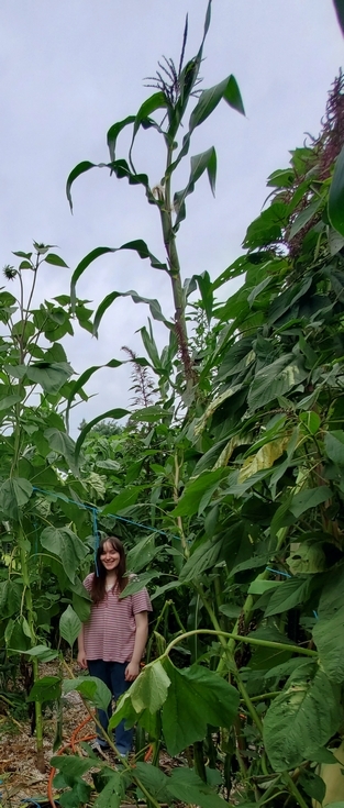 Daughter standing next to some ~18 feet tall tropical corn in the garden