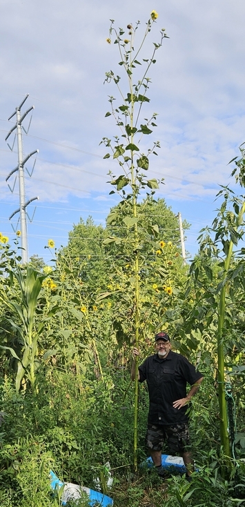 This very tall wild annual sunflower is free standing and 18'7" tall, but may get a several inches taller as the secondary branches extend. The parent of this plant was a 18'2" in 2022.