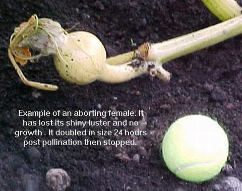 Here is an example of an aborting female pumpkin. It was pollinated on June 28th, double in size on June 29th. June 30th it went flat ( lost its shinny luster) and no growth. Goophergirl :)