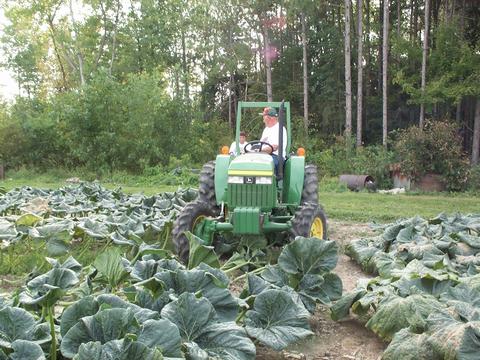 Bring in the tractor so we can weigh this monster squash! Len kind of surprised us by driving right over the plant! But, it was the only fruit on the plant!