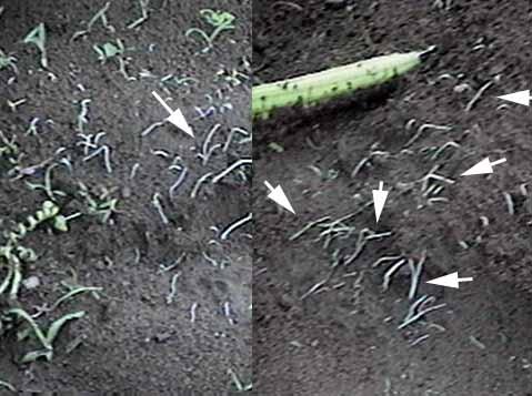 After 2.88 inches of rain, some small roots are exposed. The left panel is abbout 2 feet from the vine and the right panel is near a leaf node. Walking on the soft soil or any disturbance would easily damage these small pumpkin roots.