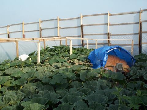 Alan's patch is behind his house at the top of a hill at the end of an open field. He had a huge problem with the wind whipping through his patch. This is the biggest, most elaborate wind break we have ever seen! It stands 11.5 feet tall and is covered in double thick 6 mil plastic. This is guy is hardcore! When we first rounded the corner and looked it was like a scene from the X-Files!