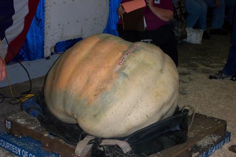 Weighing in at 336 lbs this pumpkin from Russell, MA was entered in the squash category but judged as a pumpkin. Since only one fruit per class can be entered, this smaller one was disqualified.