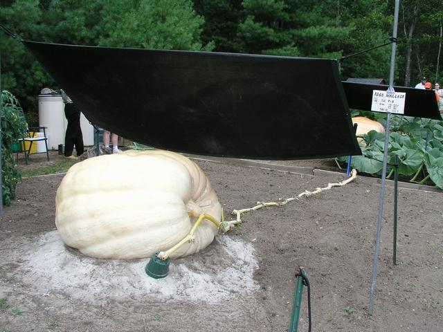 Actually, I think Fred Macari's 1068 Wallace plant must have had some problems. My guess is that he is trying to get some mature seeds from this pumpkin. Beginners please take note, it is a good thing to have SOME leaves.