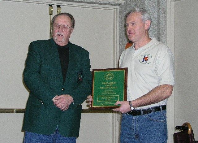 Bob MacKenzie grew a true green squash weighing 1063.5 pounds in 2005. This took the top spot for squash. He is being presented his award from 2004 champ Steve Razo.