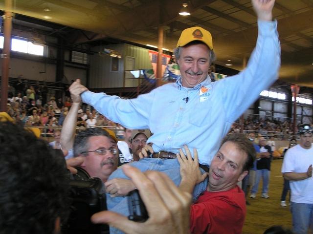 Ron Wallace and Peter Rondeau, lift the new World Champ, Joe Jutras, to their shoulders at the Topsfield Fair on September 29, 2007, after hearing the weight of his Giant Pumpkin. It weighed and awesome 1689 pounds.