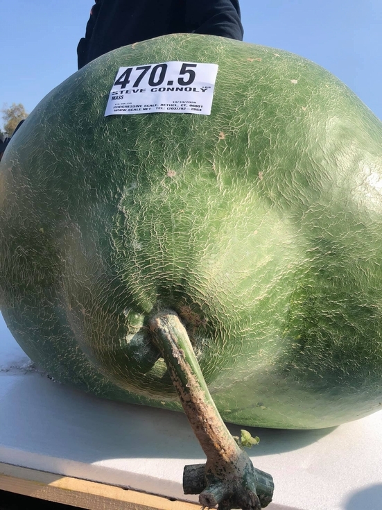 This is the stem end of Steve Connolly's 470.5 pound WR bushel gourd. Yes, that stem had to be trimmed a bit.