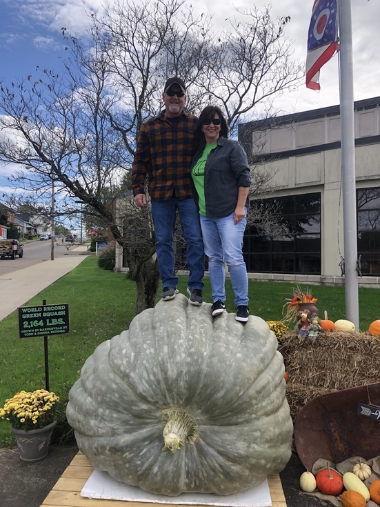 Todd and Donna Skinner standing on their WR squash of 2164 pounds. Congratulations!