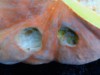 Probably due to some dirt that went flying on the pumpkin when it rained , next year ill try to get those big red carpet to put under the pumpkin , i ve tried to scrape and sulfured the spots for a week but now its too late