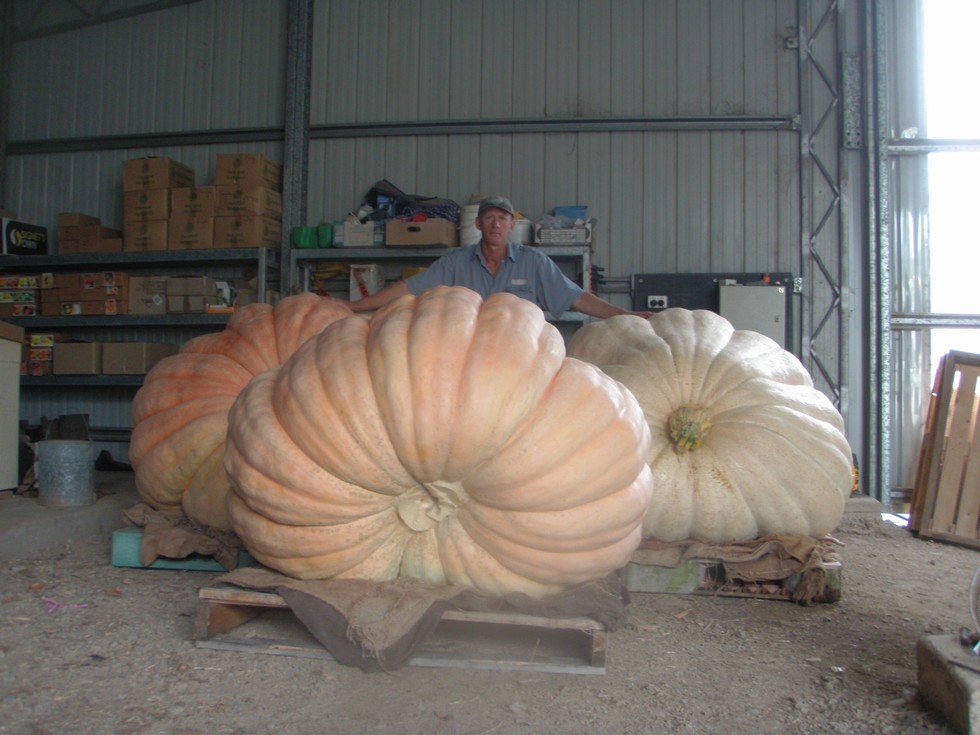 another shot of all three after taking the cover off the jarvis it ended up taping 403 inches and it weighed 601.5 kgs with the lifting straps so its weight would be right on 600 kgs as the straps weigh almost 1.5 kgs this one is my best hope for sydney royal easter show as at the moment it has no problems but the show is not till easter and a lot can go wrong between now and then because thats a long time to try to keep a pumpkin and hope it doesnt go off any way i am happy to grow one bigger than last year even though it ended up with a hole in it now the hard decision of what seed to order for next season we have a weigh off at kyogle on the 15th of february i think and it sounds like there will be a fair few big pumpkins there i am looking forward to it