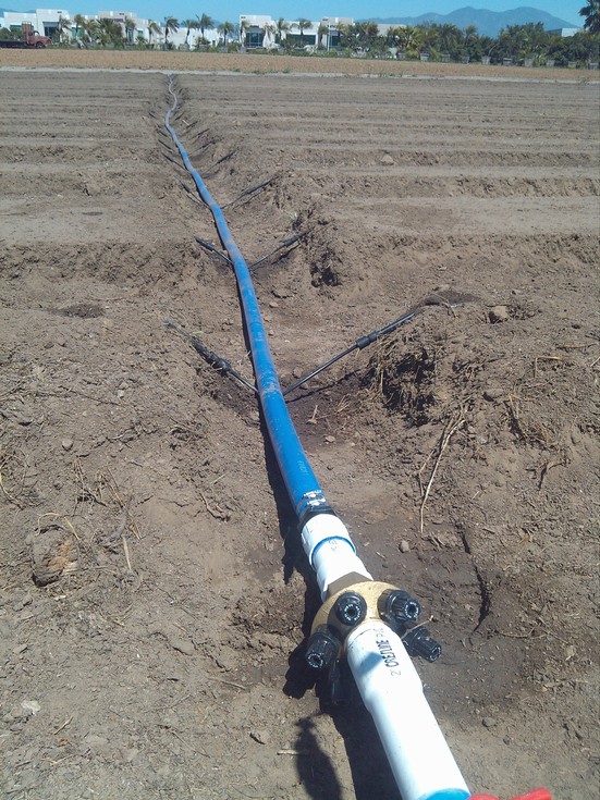 Connected t tape drip pipe to 2 in. lay flat. Covered connections so coyotes and crows will not chew through.