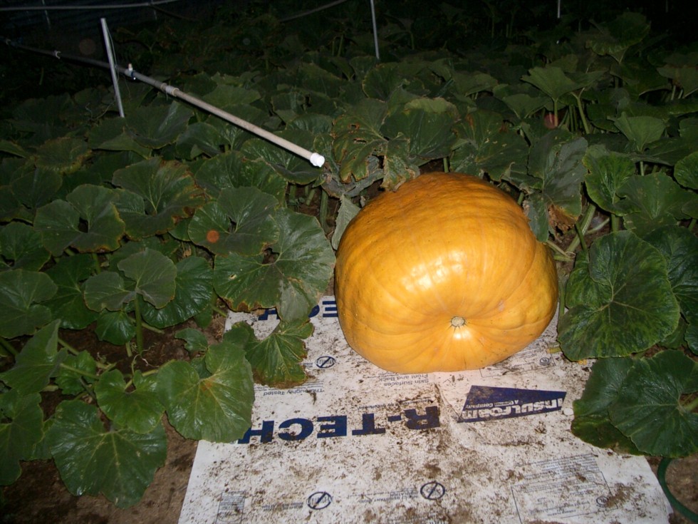 shot of my super orange pumpkin--on secondary vine--main was fried by heat---it is very nice looking --maybe it will reach 4 or 500 I hope--day 27 here