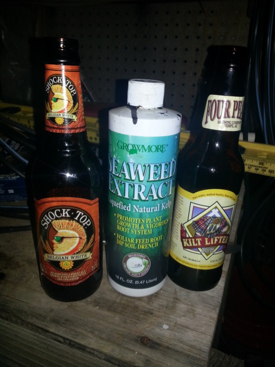 (This clever post should have gone with this clever picture)...This evenings spray exercise was brought to you by the (local) makers of "Kilt Lifter Scottish Style Ale" and (non local) "Shock Top Belgian Wheat"...and the letter "S" for Seaweed.....the compost tea tends to be a bit "nutty"....so I would suggest one of our sponsors products for refreshment while working the sprayer.