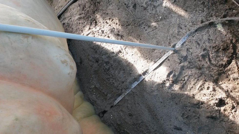 I was asked how much top overhangs out from bottom of pumpkin at blossom end well, 420mm just over 16inches. Camera angle all wrong but stick is straight up and down.