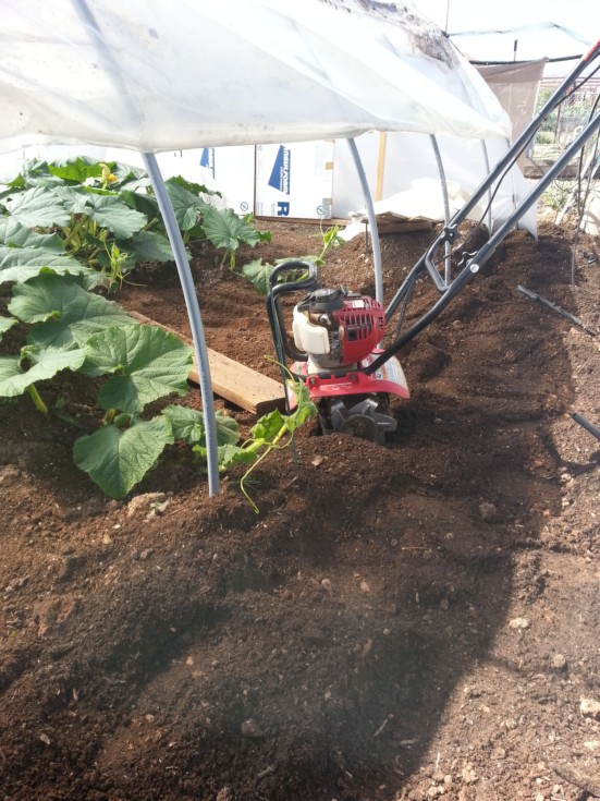 Rolled up the north side of tunnel one and tilled the rest of the growing area, installing 1/4" drip lines here this afternoon, like I did on the 1622 couple weeks ago. Still hand watering, but with the warmer temps, drip will need to be fired up this week or next.