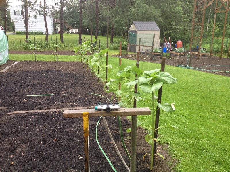 The row of Mitchell tall sunflowers are doing well with the tallest being 5.5 feet as of today. Wet and cool doesn't seem to be slowing them down.
