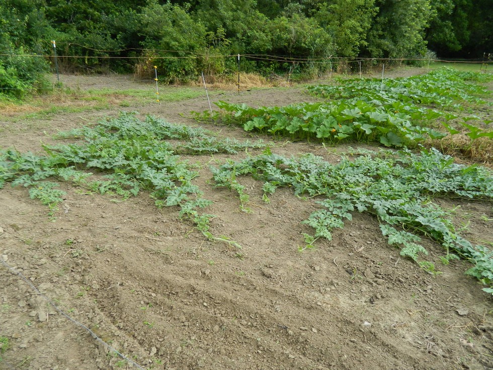 A pair of 260.5 Clementz watermelons at the end of the field pumpkin patch. This sure looks better than the weedy muddy mess I had for a watermelon patch last year. I'm hoping for a new personal best, and I'm keeping up with regular feedings.