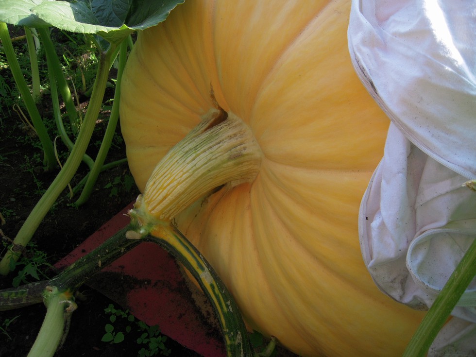 But, this isn't something you want to see when you go and measure your pumpkin. 1756 Howell @ day 35, EST 600 lbs, gaining about 40 lb/day now. Split goes all the way through the stem and inside the pumpkin (not into the cavity), couple inches deep.