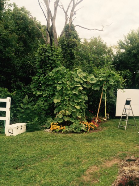 The long gourd is taking over .. I see downy and aphids.. If we had a gas sprayer I could prolly reach up there ...turns out keeping them off the ground is about as fun as hanging Christmas lights...