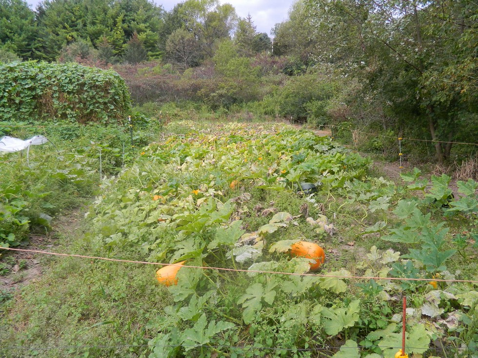 Main field pumpkin patch is shutting down for the year. Lots of PM, competition for moisture from nearby trees. Still we have lots of 60#+ pumpkins. Some should go over 80#. The 95,5 House pumpkin in the main AG patch was pulled yesterday. Lots of PM and another disease. The smaller young pumpkins were starting to rot.