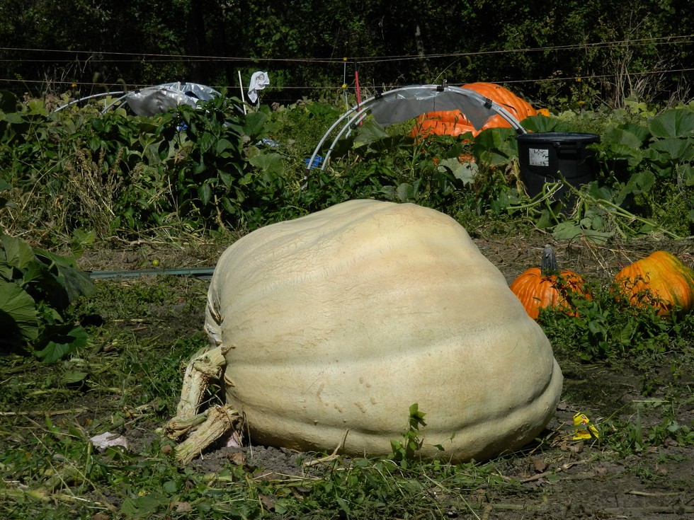 Jacob's white pumpkin and my orange one in the back. Now we have to pick out our field pumpkin entries. I have several big round ones about the same size and Jacob has several tall ones close to the same size. I think we will take the bathroom scale and a chunk of plywood to set it on down to the patch to make the decision. Biggest ones go to Anamosa, the next ones get weighed the following week.